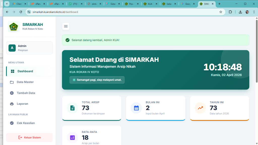 Aplikasi berbasis web ini merupakan inisiatif langsung dari Penghulu KUA Rokan IV Koto, Dian Pratama, S.Ag. Inovasi ini lahir dari kebutuhan mendesak untuk mempermudah pengelolaan arsip yang selama ini masih dilakukan secara manual, yang seringkali memakan waktu lama dalam pencarian data dan rentan terhadap kerusakan fisik.